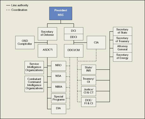 A seguito degli attentati dell'11 settembre 2001, vi sono state numerose ristrutturazioni (quindi lo schema qui sopra è in parte superato), e in particolare, nel 2004, quella impostata dall'Intelligence Reform and Terrorism Prevention Act: che istituisce la National Intelligence, il cui direttore, che risponde al Presidente degli Stati Uniti, è il principale consigliere del Presidente, del National Security Council e dell'Homeland Security Council;