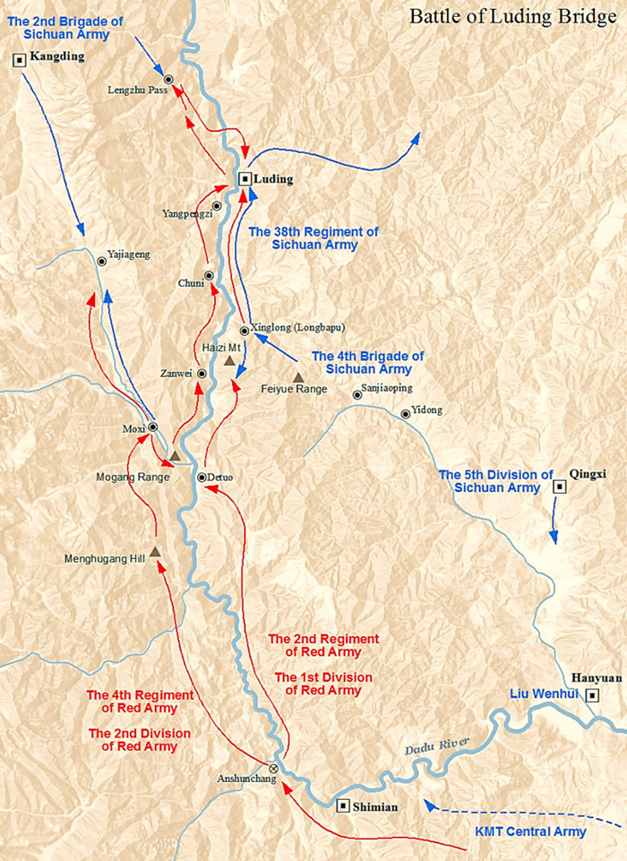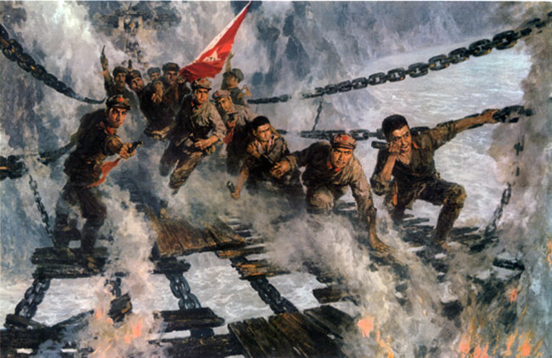 La decisione di marciare verso il nord fino alla Grande muraglia implicava la necessità di affrontare gravissimi ostacoli naturali, oltre che militari, soprattutto in quanto la linea sud-nord, che sarebbe stata la più diretta ed ovvia, era bloccata dal nemico: le forze rosse si resero conto ben presto di dover compiere una larga manovra di spostamento verso le zone più selvagge dello Yunnan e dello Szechuan se volevano aprirsi un varco. In effetti le condizioni naturali di queste zone, incidendo su uomini già stremati, provocarono le più gravi perdite. Le forze locali del Kweichow erano state scompaginate dalla tattica partigiana rapidissima che le forze rosse adottarono dividendosi in molte colonne, disperdendosi nei villaggi per fare attività di mobilitazione e di propaganda e concentrandosi poi per vibrare brevi attacchi notturni su un nemico avvezzo ad una guerra poco impegnativa. Questa lunga attività di guerriglia era stata resa possibile dalla decisa sconfitta inferta al Kuomintang poche settimane dopo la conferenza di Tsunyi al passo di Loushan, che era considerato la chiave della Cina sud-occidentale. La battaglia fu considerata sempre decisiva nella storia della Lunga marcia. In essa l’avanguardia adottò lo schema tipico delle battaglie di Lin Piao: un lungo lavoro di agitazione tra i contadini, una serie di finte e di movimenti miranti a disorientare il nemico, una lenta ritirata (durò cinque giorni) verso un passo montano naturalmente impervio, e qui un breve attacco notturno condotto con estrema concentrazione di forze e contando sulla sorpresa: nove nuovi reggimenti del Kuomintang erano caduti nella trappola. Traversata nella primavera la lussureggiante regione subtropicale dello Yunnan, le forze rosse giunsero ad uno dei punti più difficili della loro impresa: erano ancora a sud dello Yangtze, il grande fiume della Cina meridionale, la barriera che tradizionalmente le armate ribelli non riuscivano a passare. Chiang Kai-shek lo sapeva benissimo e sperava ancora di fermare e di annientare i suoi nemici, benché questi avessero risalito a monte le acque del grande fiume (che nello Yunnan si chiama Chinsha), aveva militarizzato tutti i traghetti ed aveva posto truppe fedeli di sentinella in tutti i punti nei quali il passaggio avrebbe potuto essere tentato. Ma la fortuna, l’inganno e l’inefficienza del nemico assistettero ancora una volta le forze rivoluzionarie: fingendosi reparti del Kuomintang rimasti dispersi sulla riva meridionale (e forse anche corrompendo i battellieri ) alcuni reparti riuscirono a catturare un certo numero di barche, a farsi portare sulla riva settentrionale, cogliendo nel sonno la guarnigione di guardia al traghetto e assicurando con ciò all’intera forza dei rossi la possibilità di passare il grande fiume in condizioni quasi normali. L’impresa avrebbe richiesto molto tempo, perché anche i traghetti erano pur sempre barconi (sei barconi esattamente) e le forze rosse, completate da nuovi guerriglieri reclutati nello Yunnan e nel Kweichow, non erano molto al di sotto dei 50 mila uomini: ma neppure un guerrigliero morì nella traversata. Dopo una catena di montagne abitata da minoranze primitive, un altro fiume aspettava le forze rivoluzionarie che stavano attraversando in linea retta la regione selvaggia tra Sikang e Szechuan: il fiume Tatù, una valanga di acqua di montagna, che terrorizzò le avanguardie che dall’alto delle montagne una notte ne sentirono per prime il rombo tra le gole. Il Tatù aveva infatti una pessima fama nella storia delle lotte rivoluzionarie cinesi: fino alle sue acque impetuose erano riusciti a giungere anche gli ultimi superstiti dei T’ai-p’ing guidati da Shih Ta-k’ai, ma la vendetta dei proprietari terrieri li aveva raggiunti prima che passassero il fiume. Nel borgo di Anshunchang, sulla riva meridionale, convennero tutti i dirigenti del partito e dell’esercito e tennero consiglio di guerra. In un primo tempo si sperò di potersi servire come sempre di un traghetto: ed infatti la fortuna assistette i rossi, che riuscirono a catturare una barca, a forzare il blocco della riva settentrionale e a conquistare i due imbarcaderi; ma non era pensabile di traghettare l’intero esercito per la rapidità delle acque, la lentezza della traversata e la fragilità delle barche. Passarono alcune migliaia di uomini dell’avanguardia, ma il grosso dovette tentare un’impresa anche più difficile: 200 chilometri a monte di Anshunchang esisteva l’unico ponte sul Tatù, il ponte di Lu Ting. Come tutti i ponti del Szechuan occidentale era una passerella alta sulle acque e senza sponde, retta da catene secolari di ferro fissate alle rocce dalle due parti ed oscillante al vento. L’instabile impiantito era costituito da larghe tavole di legno e le due testate del ponte erano - ovviamente - presidiate dal nemico. Le forze rosse dovettero ingaggiare un’altra gara contro il tempo, perché per controllare il ponte stavano arrivando le temute truppe speciali di Chiang. Quando l’avanguardia giunse a tappe forzate presso il ponte, dopo aver coperto più di cento chilometri in un giorno per distaccare un reparto di truppe scelte del Kuomintang in marcia dall’altra parte, ebbe la tragica sorpresa di scoprire che le assi dell’impiantito erano state rimosse e che soltanto le catene nude dondolavano al vento: dalla riva opposta la guarnigione del Kuomintang faceva beffe invitando i rossi a volare. Dopo breve consiglio di guerra e dopo aver piazzato le poche mitragliatrici disponibili a copertura della testata del ponte, la cui guarnigione occidentale era stata già quasi annientata, furono estratti a sorte 22 dei molti volontari che si erano offerti di tentare il passaggio a forza di braccia, reggendosi alle nude catene. Alle loro spalle furono fissate dodici granate e una pistola per ciascuno: con molta lentezza e sotto il tiro delle mitragliatrici nemiche, una parte dello sparuto gruppo riuscì a giungere viva 