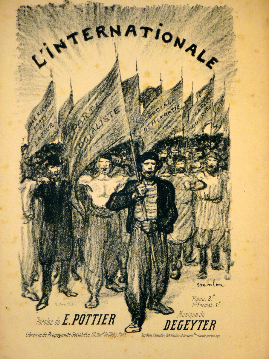 L'Internazionale è la più conosciuta canzone socialista e comunista, ed è diventatata l'inno dei lavoratori in tutto il mondo e si può dire che ne esista una versione quasi in ogni lingua parlata sul pianeta. Le parole originali furono scritte nel 1871 da Eugène Pottier, operaio e poeta, per celebrare la Comune di Parigi, a cui aveva partecipato attivamente; Pierre de Geyter scrisse la musica nel 1888 e fino ad allora il canto veniva generalmente intonato sull'aria della Marsigliese (composta nel 1792 come Canto di guerra dell'Armata del Reno). All'inizio del XX secolo in molti paesi l'Internazionale era proibita a causa del suo carattere esplicitamente rivoluzionario e delle sue liriche d'ispirazione insurrezionalista. Già nei primi anni del ‘900, comunque, era cantata in tutta Europa: nel 1904 è intonata al secondo Congresso dell’Internazionale dei lavoratori e col successivo (1910, Stoccarda) è proclamata canto universale del movimento operaio. L'Internazionale divenne dunque l'inno del socialismo rivoluzionario, ed il suo ritornello è molto chiaro: C'est la lutte finale / Groupons-nous et demain / L'Internationale / Sera le genre humain (È la lotta finale / Uniamoci e domani / l'Internazionale / Sarà il genere umano). Tradizionalmente è cantata col pugno chiuso levato. La traduzione italiana non è molto fedele e nacque da un concorso indetto dal giornale satirico L’Asino nel 1901: vinse la versione firmata con lo pseudonimo "E. Bergeret" (non si sa con esattezza a chi appartenga) e in questa forma è cantata ancora oggi.