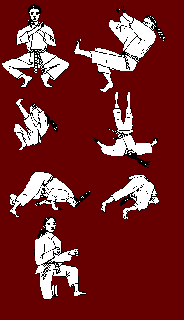 Tornando alla caduta all’indietro, vediamo come si deve eseguire, tenendo conto che i vari movimenti non devono svolgersi a scatti, ma in una sequenza fluida: dalla posizione eretta accucciatevi su di un tallone e incrociate le braccia di fronte a voi, lasciandovi cadere all’indietro; nel frattempo distendete in avanti l’altra gamba e appena prima di toccar terra con la schiena eseguite la battuta delle mani, che colpiranno terra con tutto il palmo e torneranno immediatamente indietro; le braccia, che dovranno essere a circa 45 gradi rispetto all’asse del corpo, sono dritte ma non rigide, mentre il corpo deve restare raccolto per evitare di battere la testa