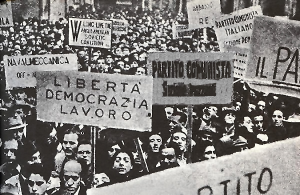 Note: 1) Unità, ed. dell'Italia meridionale, gennaio 1944 2) Unità, ed. dell'Italia meridionale, gennaio 1944 3) "Quando occorre tenere in mano una caffettiera bollente, è meglio non rompere il manico finché non si è sicuri di averne un altro egualmente comodo e pratico e comunque finché non si abbia a portata di mano uno strofinaccio. I rappresentanti dei vari partiti italiani che si sono riuniti 15 giorni fa a Bari sono naturalmente bramosi di diventare il governo d'Italia. Certamente essi non hanno alcuna autorità elettiva e certamente non avranno alcuna autorità costituzionale sino a che l'attuale re abdichi, o egli stesso o il suo successore non li invitino ad assumere questo ufficio. Non è affatto sicuro che essi avrebbero qualche effettiva autorità sulle forze armate italiane attualmente combattenti assieme a noi. L'Italia giace prostrata sotto le sue miserie e le sue sventure" (dal discorso di Churchill ai Comuni, 22 febbraio 1944). 4) Dai giornali dell'epoca. 5) Dai giornali dell'epoca; v. anche Agostino Degli Espinosa, Il Regno del Sud, Firenze, Parenti, 1955, p. 374 6) Per la libertà e l'indipendenza d'Italia. Relazione della direzione del PCI al V Congresso, Roma, edizioni Unità, 1945. 15) R. Battaglia, Storia della Resistenza italiana, cit., p. 221. 16) Palmiro Togliatti, Discorso al Modernissimo di Napoli, 11 aprile 1944, riportato in La via italiana al socialismo, Roma, Editori Riuniti, 1964, p. 50. 17) "[...] Ciò che nell'Italia del Sud era stato considerato un 'colpo di scena', che a Roma aveva dato luogo ad una violenta polemica sfociando infine nel rinsaldamento, almeno formale, del fronte antifascista, ebbe nel Nord un effetto diverso, come diversa era la situazione sul campo di battaglia dove già i monarchici ed i repubblicani combattevano fianco a fianco." R. Battaglia, Storia della Resistenza italiana, cit., p. 280. La diversità di situazione viene colta e riassunta chiaramente anche da Leo Valiani quando scrive: "Il Comitato centrale di liberazione, nella situazione di Roma assediata, era ridotto ad un'attività simbolica. Ma essa non corrispondeva alla situazione del Nord. Da parecchi mesi tutto il nostro sforzo era volto a fare del CLN dell'Alta Italia un effettivo potere popolare governativo, un governo segreto riconosciuto dalla popolazione. Avevamo dietro a noi un esercito partigiano effettivo, delle masse popolari effettivamente in moto, perfino degli organi esecutivi di amministrazione rivoluzionaria. Con gli alleati eravamo in effettivi quotidiani rapporti di cobelligeranza che potevano tradursi da un momento all'altro in cooperazione strategica della massima importanza. Sconfessare pubblicamente e lacerare gli impegni regolarmente assunti dal Partito d'Azione nel Sud, per gli amici di Roma significava solo una protesta diplomatica e morale, ma per il Nord avrebbe significato una scissione effettiva nel seno delle forze belliche effettive. I diplomatici possono sottilizzare sul valore di una firma, come quella data a Napoli, ma non può farlo chi ha la responsabilità di un esercito, sia pure quello partigiano." L. Valiani, Tutte le strade conducono a Roma, cit., p. 238. 18) Franco Catalano, La missione del CLNAI nel Sud, in Il movimento di liberazione in Italia, maggio 1955, n. 36. Charles F. Delzell, I nemici di Mussolini, Torino, Einaudi, 1962, p. 442. 19) Trent'anni di vita e di lotte del PCI, "Quaderno di Rinascita," 1951, testo non firmato, ma sicuramente di P. Togliatti, p. 153. 20) L’Unità garanzia della vittoria, La Nostra Lotta, a. II, 25 agosto 1944, n. 14. 21) “Le nostre organizzazioni devono prendere in seria considerazione la situazione delle masse popolari, i loro bisogni immediati, le loro rivendicazioni urgenti. Le concessioni strappate sinora sono irrisorie. L’agitazione economica per le rivendicazioni immediate degli operai, dei contadini, dei lavoratori, deve continuare, allargarsi, trasformarsi in possente movimento di massa, in scioperi, manifestazioni di strada. La difesa dei bisogni immediati delle masse si indentifica perciò nella lotta per la cacciata dei tedeschi e dei fascisti.” Luigi Longo, rapporto presentato alla Conferenza dei Triumvirati insurrezionali, in La Nostra Lotta, a. II, 25 novembre 1944, n. 19-20. |