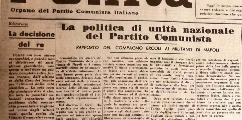 Ritengo che l'iniziativa presa dal compagno Ercoli non significhi affatto condanna della linea politica seguita dal partito. La linea politica seguita dal partito è stata fondamentalmente giusta. Affermare questo non significa rifiutarsi di fare l'autocritica, perché l'autocritica si può fare anche se una politica è stata fondamentalmente giusta. Errori ed insufficienze nella nostra politica ci sono certamente stati, ma ritengo che noi dovevamo porre il problema della direzione dei CLN. Dovevamo fare di tutto per eliminare dal governo le forze conservatrici-reazionarie che erano un elemento di debolezza per la condotta della guerra contro la Germania. Non potevamo sin dall'inizio rinunciare alla direzione. I rapporti di forza ci sembravano favorevoli. Non solo in Italia tutte le forze democratiche popolari erano antibadogliane, ma anche le forze democratiche internazionali agivano nel senso di riuscire a realizzare in Italia un governo democratico (accenna alle decisioni della Conferenza di Mosca). Il nostro atteggiamento è valso d'altronde a provocare spostamenti e concessioni da parte delle forze badogliane-monarchiche. La nostra politica ha ottenuto dei risultati. Il nostro errore è stato quello di fossilizzarci, di rimanere sulle nostre posizioni anche allorquando la situazione dimostrò che era impossibile riuscire a realizzare un governo esclusivamente del CLN. Specialmente dopo Bari avremmo dovuto accorgerci che si era creato un vicolo cieco dal quale bisognava uscire al più presto. Noi avremmo dovuto mutare prima. In questo senso dobbiamo farci l'autocritica e non in quello indicato da Gino (Negarville, n.d.r.) e dagli altri due compagni di Roma. Altro errore fu l'insufficiente attività per realizzare l'unità d'azione con le forze estranee al CLN. È vero che noi dicevamo che nel fronte della lotta contro la Germania c'era posto per tutti, anche per i monarchici ed i badogliani, ma praticamente abbiamo fatto molto poco in questa direzione, né abbiamo visto il problema del come legare organicamente queste forze. La terza questione alla quale voglio accennare è questa: in che cosa è consistita la nostra politica? Non condivido il giudizio di Gino secondo il quale si tratta di salvare il nostro partito dal vicolo cieco. Questo non è vero per l'Italia occupata dove il partito in questi mesi è riuscito a scatenare una notevole lotta di massa contro i tedeschi ed i fascisti. La politica del nostro partito non si è esaurita nella polemica contro Badoglio, com'è avvenuto nell'Italia liberata. A Roma si è parlato di errore di tutta la nostra politica passata. Questo giudizio non è giusto. Ma in che cosa consiste per i compagni di Roma la politica del partito? Sono parte fondamentale di questa politica gli scioperi che abbiamo condotto, culminati nello sciopero generale di marzo, le azioni dei Gap, l'organizzazione delle brigate Garibaldi e la condotta della guerra partigiana. Nell'Italia occupata, l'attività preminente del nostro partito è stata quella della condotta della guerra contro la Germania e contro il fascismo. Ecco perché il nostro bilancio è positivo. […] Nascita di una nuova democrazia (da La Nostra Lotta, n. 11 del 10 luglio 1944) «Nel fuoco della lotta nazionale contro l'oppressore, nella partecipazione delle larghe masse popolari alla guerra di liberazione, nasce bagnata dal sangue dei caduti e consacrata dall'eroismo dei combattenti: la nuova democrazia italiana.L'articolo elencava le grandi lotte combattute, dagli scioperi del marzo 1943 alle azioni partigiane, allo sciopero generale in tutta l'Italia occupata, lotte che avevano mobilitato e risvegliato alla vita politica larghe masse di giovani, di donne, di operai, contadini e lavoratori, che avevano portato alla creazione di nuovi organismi rappresentativi: comitati di agitazione, comitati di difesa dei contadini, Gruppi di difesa della donna, Fronte della gioventù, ecc., per concludere sulla necessità di sviluppare ancora di più questa opera di riorganizzazione delle larghe masse, ed opporsi a qualsiasi tentativo di soffocarla e deviarla. «Né questo movimento di massa che deve affondare le sue radici assai profondamente può essere imbrigliato e contenuto nei limiti ristretti dei partiti politici. [...] I partiti non possono che inquadrare una parte delle energie che vengono espresse dalle masse popolari in questo loro ingresso nella vita politica. Il Partito comunista, che ha l'orgoglio di essere stato alla testa di questo movimento popolare, e che ha visto i suoi effettivi moltiplicati per l'afflusso di nuovi militanti, non pretende affatto di contenere entro i suoi ranghi tutto questo afflusso di nuove forze politiche espresse dal popolo. Accanto ai militanti comunisti od ai militanti di altri partiti antifascisti, ci sono migliaia e migliaia di operai, contadini, intellettuali che sono dei nuovi quadri del movimento popolare, degli attivisti delle formazioni partigiane, dei comitati di agitazione, dei comitati di contadini, dei Gruppi di difesa della donna, del Fronte della gioventù, che non sono iscritti a nessun partito. Ma ciò non vuol dire che essi non possano, ed anzi non debbano esercitare una seria influenza e contare sulla direzione del movimento popolare, e questo per necessità stessa della lotta, oltre che per un'esigenza strettamente democratica.Non ci limitammo ad accettare supinamente la "svolta" di Salerno, ma, nel momento stesso in cui si formava insieme a Badoglio un governo di unità nazionale, noi ponemmo con più forza e con maggiore chiarezza di prima la necessità di creare dei CLN che non fossero soltanto coalizioni di partiti, ma rappresentassero le larghe masse lavoratrici, ponemmo il problema di creare dei CLN periferici, quali organi di potere della nuova democrazia, della "democrazia progressiva aperta a tutte le conquiste". Sulla portata della "svolta di Salerno" sono stati versati dalla Liberazione in poi fiumi di inchiostro, da una parte per accusare i