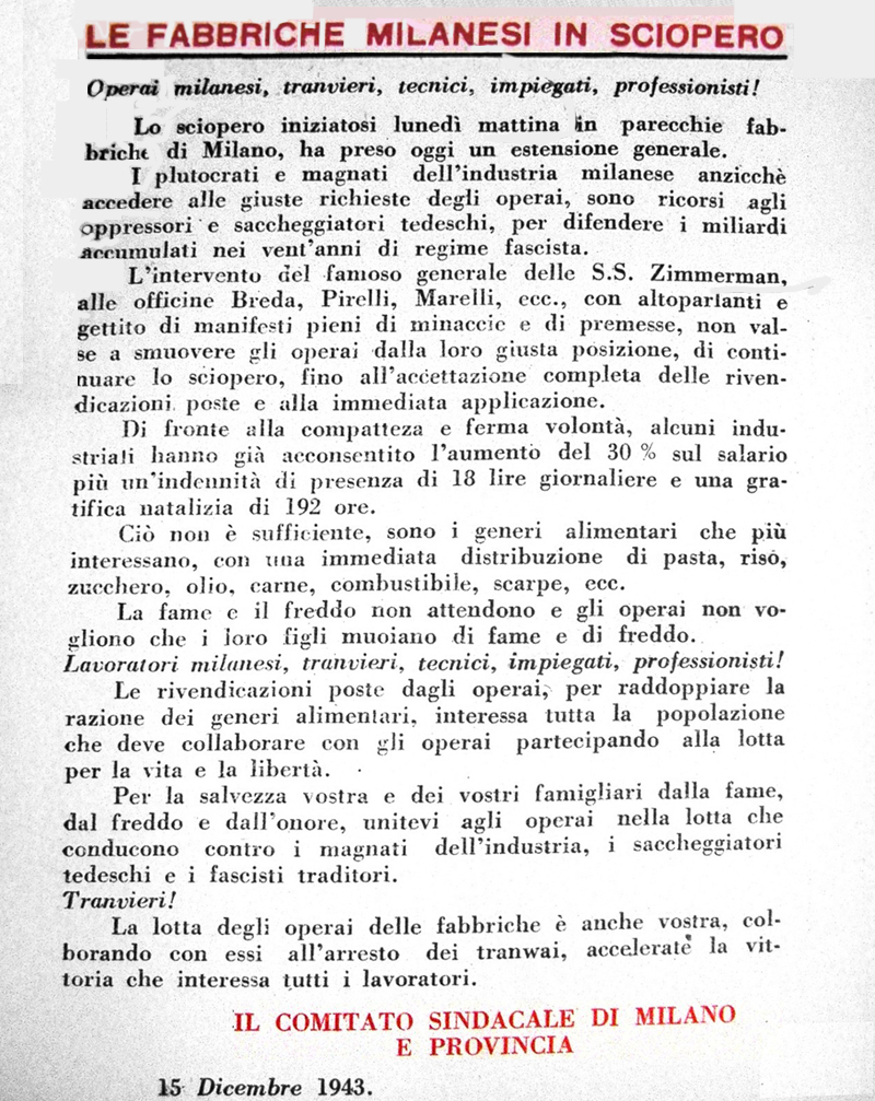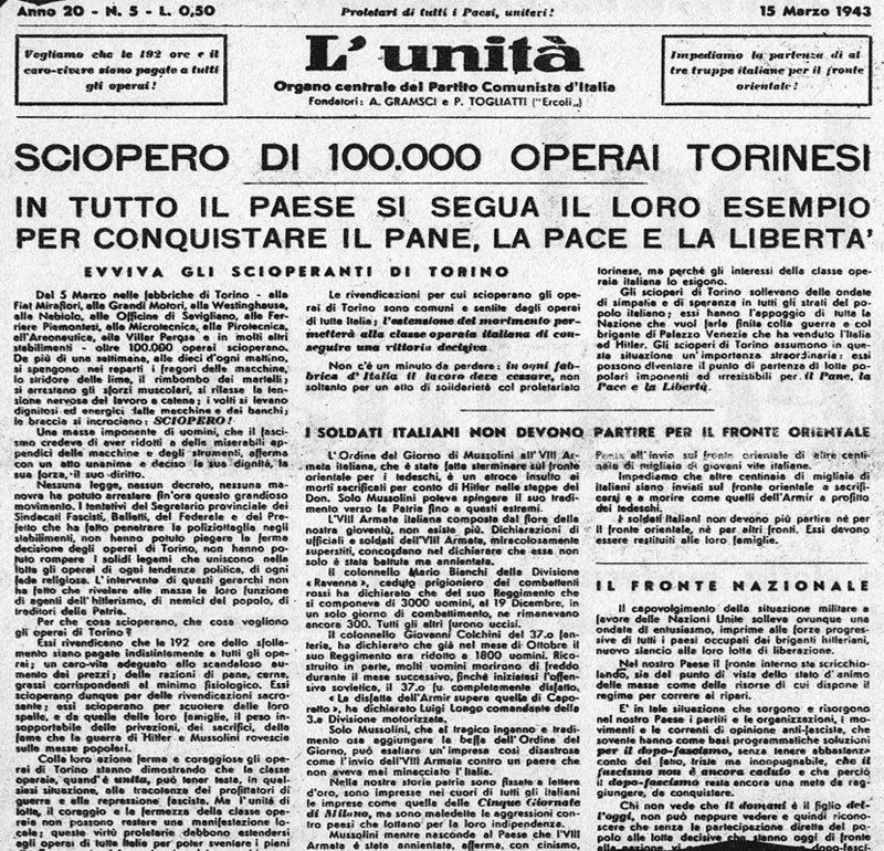 Al sesto giorno di sciopero, Mussolini, vedendo l’impossibilità di piegare la ferma decisione degli operai, non potendo rompere il solido legame che nella lotta univa i lavoratori di ogni tendenza politica e fede religiosa, non volendo far nessuna concessione alle giuste richieste delle maestranze, tentava, facendo intervenire la sbirraglia, di soffocare il movimento. Ma non ci riusciva. In tutti gli operai e in tutti i ceti cittadini gli scioperi di Torino sollevavano grandi ondate di simpatie e di speranze: essi avevano l’appoggio di tutta la nazione che voleva farla finita con la guerra. Solo Mussolini e i gerarchi fascisti erano furibondi e si preparavano alle repressioni più feroci contro i coraggiosi lavoratori torinesi. In una tale situazione, urgeva sviluppare un vasto movimento per appoggiare lo sciopero di Torino, occorreva estendere l’agitazione agli altri centri industriali del Paese per costringere il governo fascista a cedere. Il comitato operaio creato a Torino per dirigere lo sciopero, la sera del 12 marzo lanciava un manifestino ai lavoratori della città e provincia per invitarli a proseguire e ad estendere il movimento e inviava un compagno a Milano per sollecitare l’intervento di quelle masse operaie. E ora tocca a Milano Il 14 marzo a Milano si riunivano i membri della Direzione del PCI là presenti i quali, accolta la proposta del Comitato operaio di Torino, lanciavano un manifestino ai lavoratori milanesi e prendevano una serie di misure per assicurare l’estensione del movimento. Il 15 marzo veniva diffusa a Torino, Milano e in molti altri centri industriali l’Unità. Grandi titoli annunciavano: “Lo sciopero di 140 mila operai torinesi”. La direttiva era chiara: “Tutto il Paese segua il loro esempio per conquistare il pane, la pare e la libertà”. Dal 16 marzo ai primi di aprile lo sciopero si estese in tutti i principali centri industriali del Piemonte: a Pinerolo, Villar Perosa, Asti, Savigliano, Biella, nella Valle d’Aosta, ecc., e nella Lombardia. A Milano nei giorni 16, 17 e 18 marzo si riunirono i comitati di zona del PCI. Il 19 alla Caproni e in alcuni stabilimenti di Sesto San Giovanni si verificarono i primi scioperi. Nel corso della settimana successiva il movimento si estese in tutti i principali stabilimenti della città e della provincia, alla Pirelli, Breda, Motomeccanica, Borletti, Marelli, ecc. Alla fabbrica Innocenti la maestranza, composta in maggioranza di donne, scendeva in massa nel cortile della fabbrica e sosteneva violenti scontri con le guardie metropolitane inviate dai gerarchi fascisti. Alla Face in via Bovio, le operaie manifestavano al grido: “Abbasso la guerra!”. Le guardie spararono sulla folla uccidendo un’operaia e ferendone gravemente altre nove. Alla Borletti e alla Pirelli, i soldati inviati per reprimere lo sciopero fraternizzavano con gli operai. Ad Abbiategrasso un membro del Gran Consiglio fascista, Cianetti, tentava di parlare alle maestranze, ma veniva preso a sassate e messo in fuga. Alla Brown Boveri, alle ore 10 del 24 marzo, i giovani apprendisti del reparto n. 71 iniziavano per primi lo sciopero. Il direttore ing. Rolandi, accompagnato dai diversi capiservizio, si portava sul posto per reprimerlo. Gli operai del reparto n. 70, venuti a conoscenza dell’intervento del direttore, accorrevano in difesa dei giovani compagni di lavoro. Un operaio affrontava il direttore e in presenza della maestranza esponeva e difendeva i motivi dell’agitazione. Lo sciopero nel pomeriggio si estese in tutto lo stabilimento. Malgrado la repressione ordinata da Mussolini, malgrado le centinaia e centinaia di operai arrestati a Torino, Asti, Biella, Pinerolo e a Milano e provincia, lo sciopero continuò ad estendersi. La vittoria operaia L’agitazione minacciava di svilupparsi nelle fabbriche della Liguria, Venezia Giulia e dell’Emilia. Nell’impossibilità di arrestare il movimento con i soliti mezzi repressivi a causa della possente e organizzata azione delle masse operaie, il governo fascista fu costretto a cedere. Il 3 aprile, dopo un mese di scioperi, dopo l’interruzione di un mese nella produzione bellica, la classe operaia obbligava Mussolini a operare una prima grande “ritirata strategica”: i salari e gli stipendi furono aumentati. Gli scioperi, iniziati il 5 marzo, terminarono nella prima quindicina del mese di aprile con una importante vittoria della classe operaia italiana. Il grande movimento, avendo colpito il governo fascista all’interno del Paese, rappresentò il primo grande contributo della popolazione italiana alla guerra di liberazione degli Alleati. Lo sciopero ebbe un’eco in tutto il mondo e i suoi effetti furono decisivi per lo sviluppo della vita politica del nostro Paese. I popoli progressivi accolsero e salutarono gli scioperi della classe operaia italiana come una grande manifestazione degli italiani contro la guerra nazifascista. L’apparato del governo e delle organizzazioni fasciste si sgretolò. Sotto la pressione delle sconfitte militari e sotto l’azione delle masse lavoratrici italiane, il governo fascista precipitava verso la sua completa rovina.