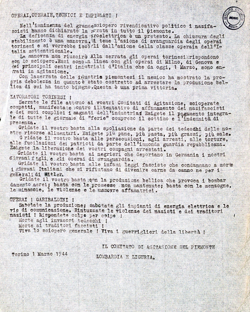 Alla Grandi Motori - stabilimento di 4 mila operai - l’iniziativa dei gerarchi fascisti rivelò che la maggioranza della maestranza nel corso della guerra aveva subito gravi perdite di peso. Risultava infatti che la perdita di peso di ogni operaio si aggirava dai 5 ai 14 chili: “operai che misuravano metri 1 e 70 ed oltre di altezza pesano soltanto 53-55 chili. La percentuale degli operai ammalati è in continuo aumento”, riferiva l’operaia C. nel luglio 1942. […] Già verso la fine del mese di maggio 1942, in una fabbrica di Asti, gli operai si mettevano in agitazione e strappavano un aumento di paga di 3 lire al giorno. A partire dal mese di agosto gli scioperi e le manifestazioni di strada si affermarono con forza e continuità di sviluppo nel nostro Paese. Da agosto alla fine dell’anno, cioè in cinque mesi, si scatenarono dieci scioperi: alla Tedeschi e alla FIAT Mirafiori di Torino, all’Alfa Romeo, ILVA, Caproni, Isotta Fraschini e per tre volte alla Falk di Milano, alla Scari di Modena; e due manifestazioni di strada: a Grugliasco e a Melegnano. Risonanza notevole ebbe la sospensione del lavoro nel reparto aviazione della FIAT Mirafiori. Questo sciopero, indetto in occasione dell’introduzione della nuova lavorazione dei motori per gli Stukas, impedì una diminuzione del salario. Era la prima volta dopo tanti anni che gli operai di questo stabilimento si mettevano in sciopero. Con l’impedire la diminuzione del loro salario e paralizzando per 24 ore la produzione bellica di Hitler, come già in occasione del 1° maggio, essi servirono d’esempio ai lavoratori torinesi. Nei primi due mesi del 1943, gennaio e febbraio, si scatenavano 11 grandi scioperi: alle Ferriere, SPA, FIAT Mirafiori, FIAT Lingotto e alla Diatto di Torino. Alla Caproni e alla Falk di Milano, alla Vai Assauto di Asti, alla Saffa in Toscana, in una fabbrica tessile nel Biellese e in una fabbrica di salumi a Fossano; una manifestazione di strada a Torino e una a Piacenza. La media degli scioperi nell’anno precedente era di due per mese; nei primi due mesi del ’43 divenne di 5,5. Mentre durante gli scioperi degli ultimi cinque mesi del 1942, gli operai di fronte alla reazione fascista sovente si piegavano e cedevano, nel corso degli scioperi dei primi due mesi del 1943, essi dimostrarono maggiore esperienza, più decisione e minore arrendevolezza alle minacce e alle persecuzioni. […] 5 marzo 1943: Torino incrocia le braccia; 8 marzo: si muovono le donne Dovevano essere gli operai della FIAT Mirafiori a dare il segnale del grande sciopero del marzo-aprile. Il 20 febbraio l’operaio L. riceveva direttive per scatenare lo sciopero. Le difficoltà per ottenere l’astensione totale dal lavoro da parte della maestranza sembravano insuperabili. In alcuni reparti dello stabilimento, oltre l’80% degli operai, provenendo dalla provincia, integrava il salario con lavori in campagna e sentivano meno i disagi alimentari. L’operaio L. e l’organizzazione, si mettevano subito al lavoro, in pochi giorni stampigliavano e diffondevano, in tutti gli stabilimenti e strade della città, migliaia e migliaia di manifestini minuscoli, composti di poche parole: “Per il pane, la pace e la libertà! W lo sciopero”.